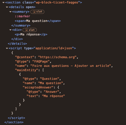 Le code html fait apparaître un balisage sémantique clair avec les balises details qui englobe une question et sa réponse et summary qui indique la question. On retrouve un code JSON pour les dénominations propres à schema.org :