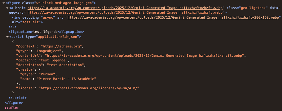 Dans le code, ce bloc contient donc des données importantes pour les robots qui scannent les sites. On retrouve le html classique avec les balises sémantiques figure, img avec le texte alternatif et figcaption. Et on peut voir ensuite le JSON compatible schema.org qui reprend toutes les données et les nomment. On retrouve l’URL de l’image, la légende, la description, le nom de l’auteur et/ou de l’organisation et enfin la licence de partage ou non :