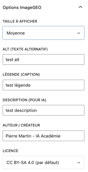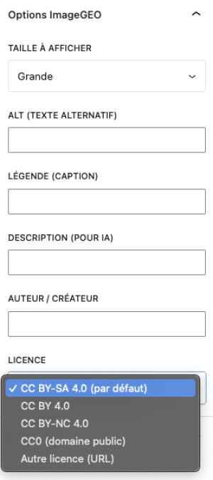 Quand on choisit ImageGEO, apparaît un bloc assez simple pour aller chercher une image dans la bibliothèque ou à télécharger :