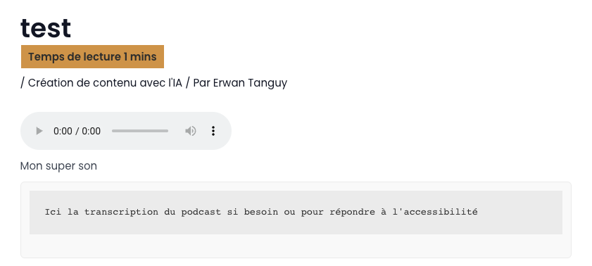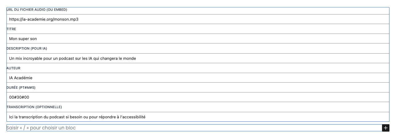 Plus simple encore que le précédent, le bloc Audio propose juste des champs à saisir. Il faut donc avoir l’URL du fichier son à lire pour que cela fonctionne :